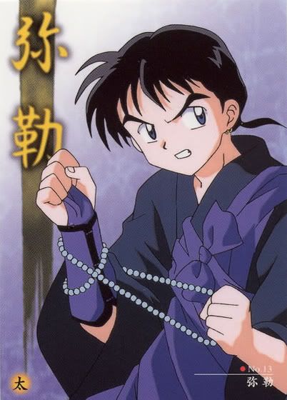 Miroku es un sacerdote fuerte y muy bien parecido, es un mujeriego cosa que Sango detesta ya que éste le propuso matrimonio y no demuestra interés en la relación. Miroku sufre en su mano derecha una maldición que le dio el demonio Naraku el cual es un agujero que traga todo lo que está a su alrededor (Kazaana), pero este agujero con el tiempo también tragará al que lo posee, por eso Miroku se convirtió en compañero de viaje de Inuyasha y Kagome, ya que debía buscar a Naraku y destruirlo para poder deshacerse de esa maldición. Su edad es 18 años.